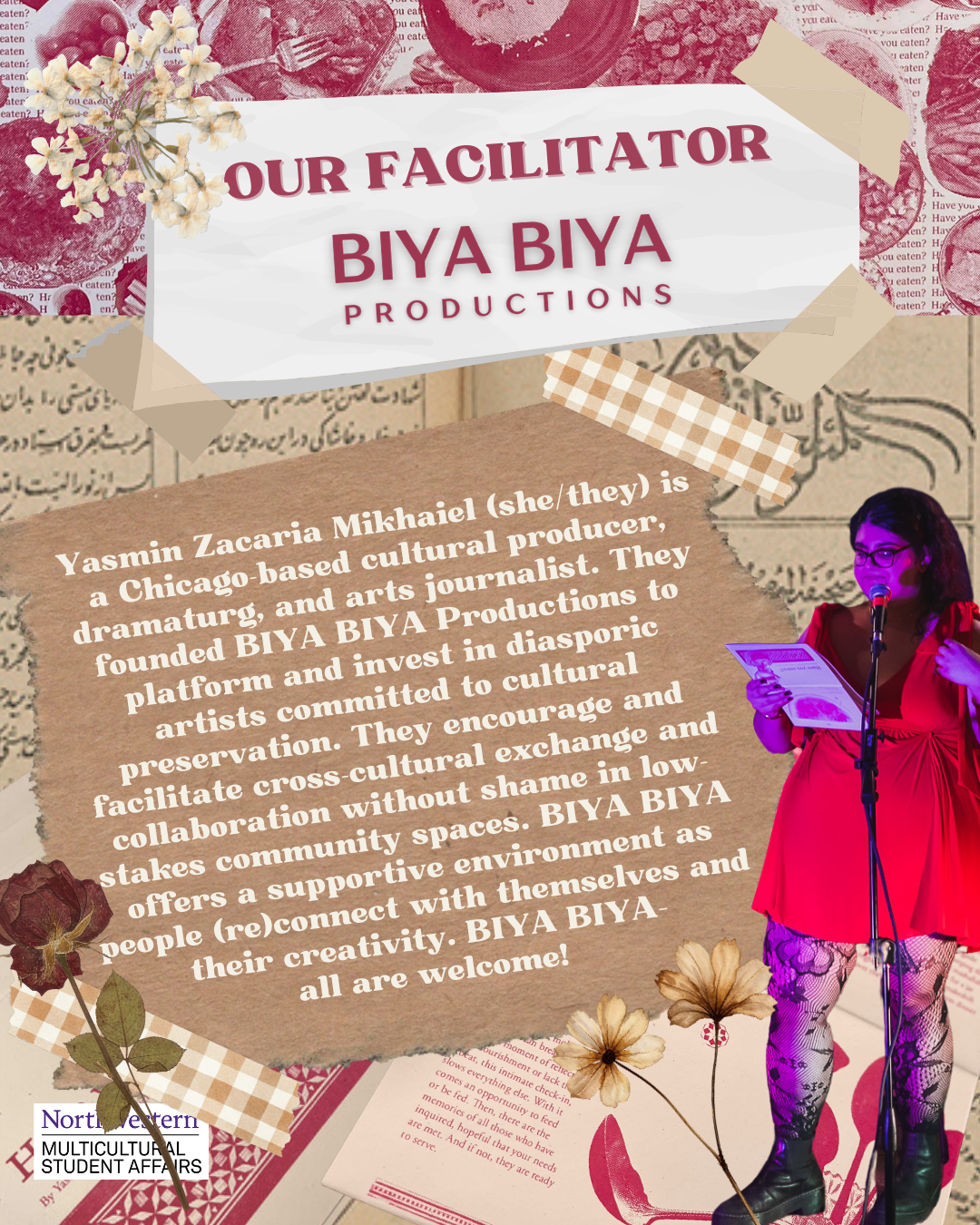 ABOUT OUR FACILITATOR Yasmin Zacaria Mikhaiel (she/they) is a Chicago-based cultural producer, dramaturg, and arts journalist. They founded BIYA BIYA Productions to platform and invest in diasporic artists committed to cultural preservation. They encourage and facilitate cross-cultural exchange and collaboration without shame in low-stakes community spaces. BIYA BIYA offers a supportive environment as people (re)connect with themselves and their creativity. BIYA BIYA—all are welcome!